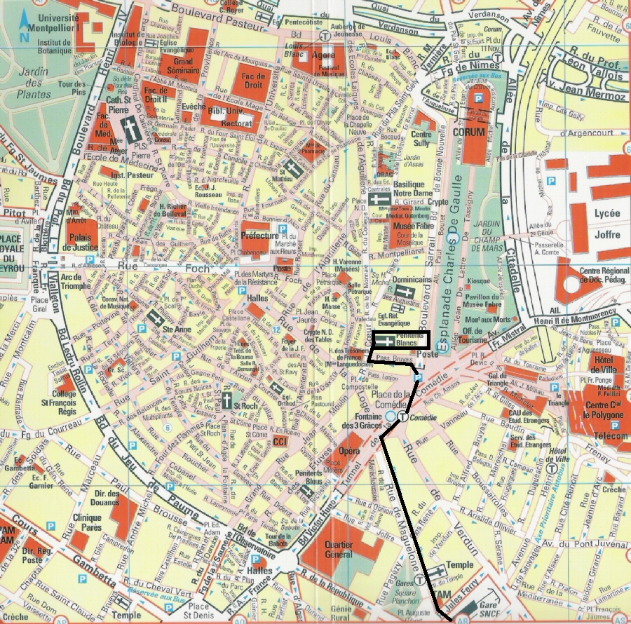 De la Gare Saint Roch,  il faut descendre dans la salle basse en suivant les indications "Sortie centre ville" et prendre en face la rue Maguelone, à droite du square Planchon, la remonter jusqu'à la place de la Comédie le long de la voie du tramway, traverser la place de la Comédie et prendre le passage Bruyas à l'angle du restaurant "QUICK" et du bureau de poste, puis tourner à droite rue Jacques Coeur.